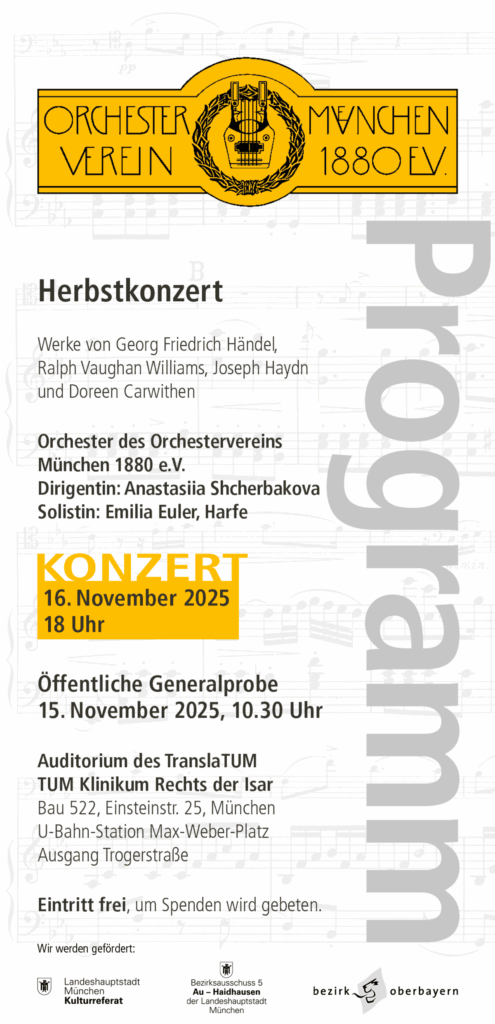 Unser nächstes Herbstkonzert findet am 16. November 2025 um 18 Uhr im TranslaTUM, Klinikgelände Rechts der Isar, statt. Die öffentliche Generalprobe findet am 15. November 2025 um 10:30 Uhr ebenfalls im TranslaTUM statt. Auf dem Programm stehen u. a. Werke von Georg Friedrich Händel, Doreen Carwithen, Ralph Vaughan Williams und Joseph Haydn. Weitere Informationen finden Sie auch in unserem Konzertflyer.